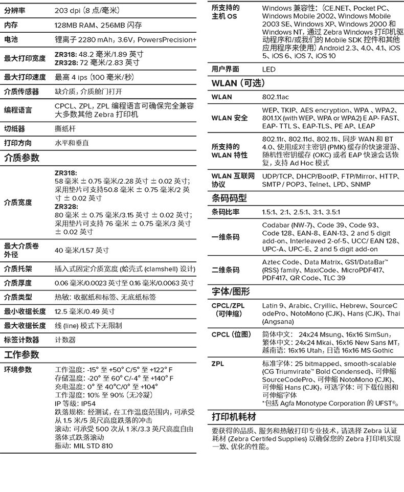 ZEBRA 斑马蓝牙便携打印机 无线条码标签打印机 ZR328 蓝牙WIFI版 (72mm宽)