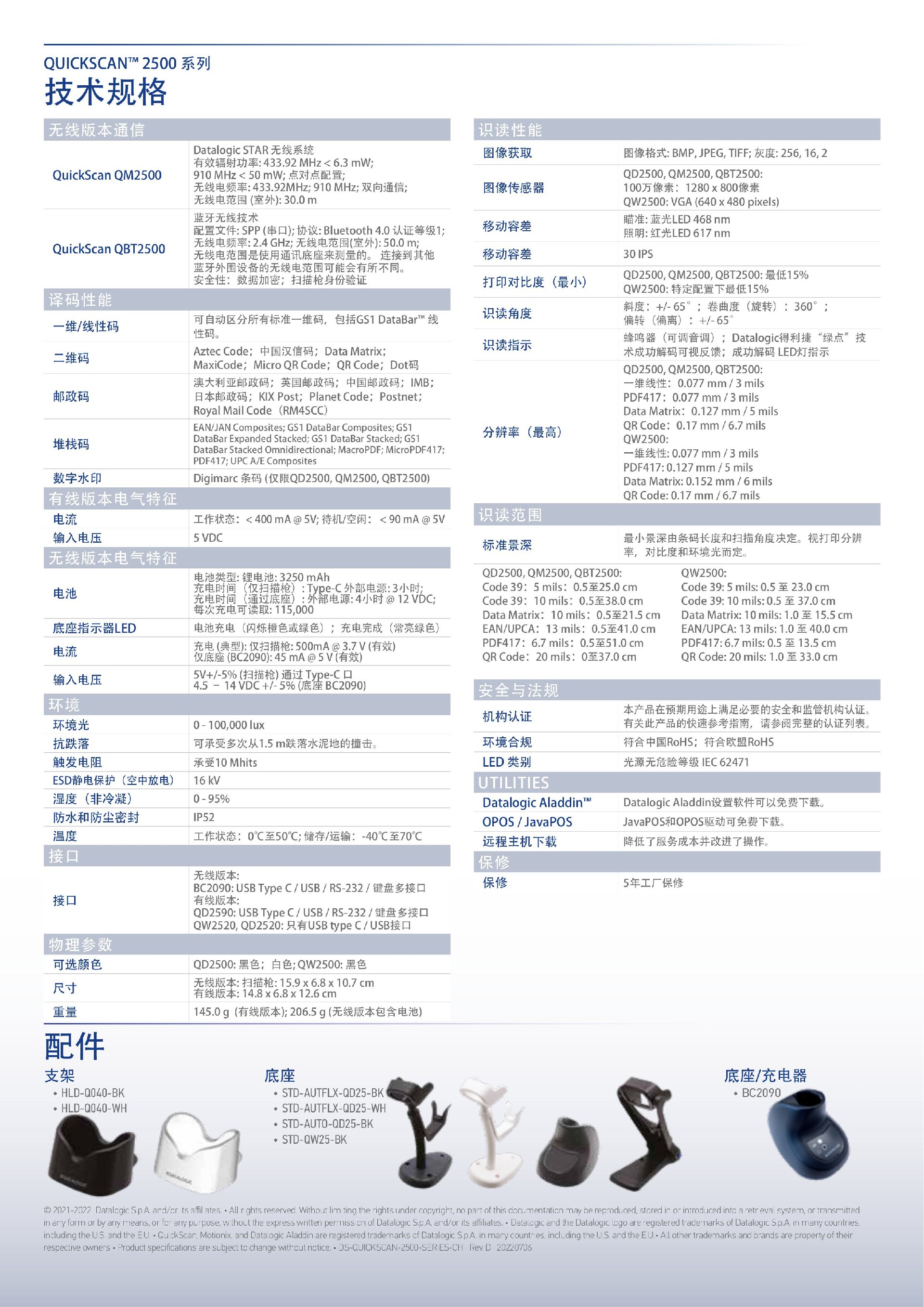 POS收银时最快速的响应 QuickScan 2500二维扫描枪是您在POS收银时值得信赖的伙伴。 它非常清楚快速读取的重要性,无论是难以读取、印刷不良、污 损的条码,还是移动设备屏幕上条码,以及隔着有机玻璃屏障, 它都能轻松扫描解码,优点众多,但价格却相当可人。 精度极高 该款扫描枪随时向操作者传递着一种极致的精准感,通过清晰地 显示扫描枪的指向,方便精准扫描。从QW型号的直观蓝点开始, 甚至可以通过QD,QM和QBT型号的出色瞄准器获得所需的所有 额外精度 。 Datalogic得利捷 的“绿点”技术则可以可视反馈成 功解码,“绿点”完美地显示 在条形码的中心和两个三角形之 间。该扫描枪同时也支持响亮的 成功解码声音反馈,可根据您的 喜好调整音调和声音。柔和的红 色照明降低了操作者用眼疲劳。